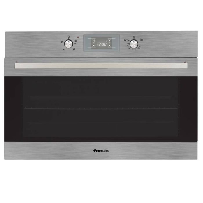 Four Encastrable à GAZ FOCUS – Volume: 105 Litres – Largeur: 90 cm – Classe Énergétique: A – Chaleur tournante – Minuterie Électronique – Tourne broche – Porte 2 vitres – 1 Plateau – 1 Grille – Dimensions: 89.5 x 59.4 x 55.1 cm – Couleur: Inox – Garantie: 2 ans