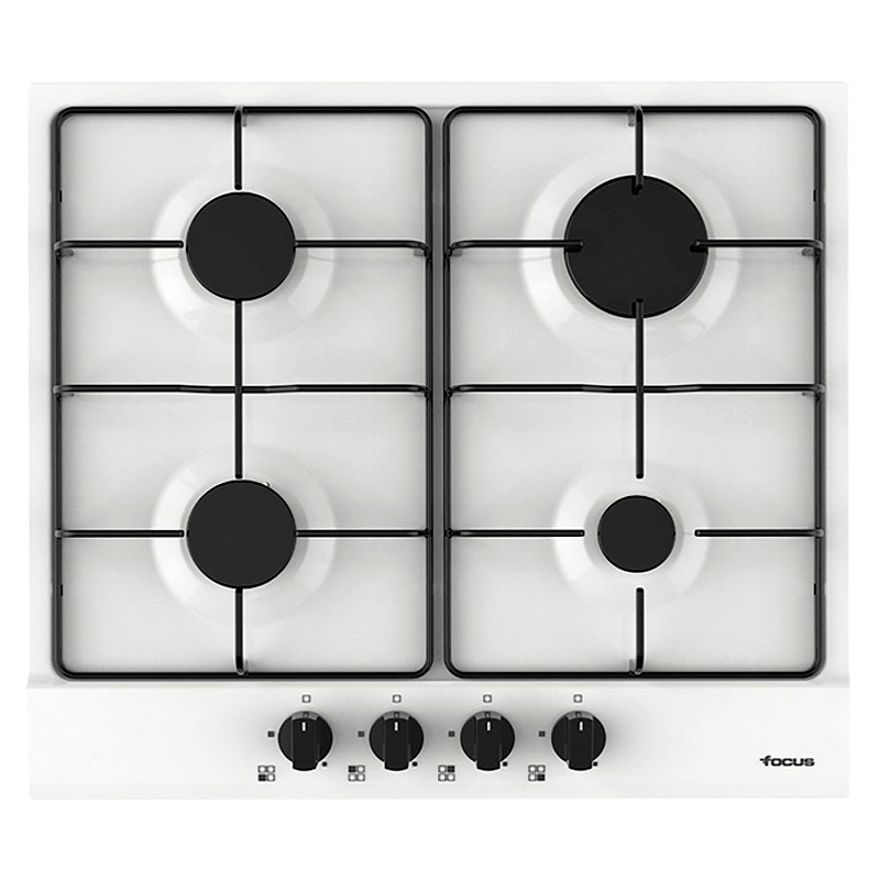 Plaque de Cuisson Encastrable FOCUS – Type de Plaque: à Gaz – Largeur: 60 cm – Nombre de Foyers: 4 Foyers – Flamme Stabilisée – Grilles et Chapeaux de Brûleurs émaillées – Commandes frontales – Allumage Automatique – Dimensions: 59 x 52 x 5.1 cm – Couleur: Blanc – Garantie: 2 ans